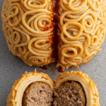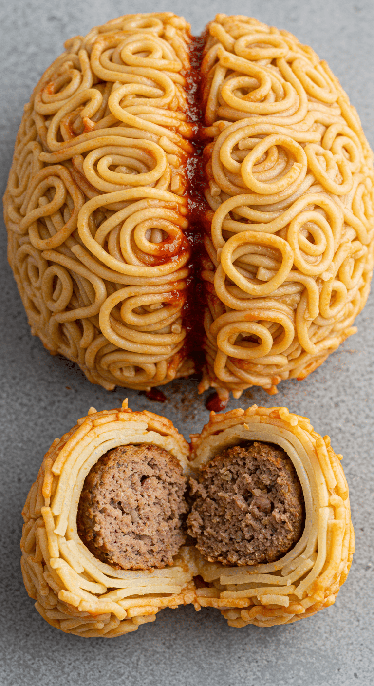 The Meatball-Stuffed Pasta Brain is the ultimate Halloween dish—creepy, savory, and packed with surprises. With its quick 45-minute active prep, protein-rich meatballs, and eerie brain-like look, it’s perfect for spooky parties or family dinners. Whether you keep it classic or try a new variation, this dish will have your guests screaming with delight. So grab your noodles, shape that brain, and enjoy the ghoulish goodness! Share your creations in the comments—what’s your favorite way to make this pasta brain extra creepy?