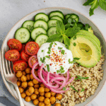This Mediterranean Quinoa Bowl is a total winner: it’s a colorful mix of fluffy quinoa, crispy spiced chickpeas, crisp cucumbers, juicy tomatoes, and creamy avocado, topped with zesty pickled onions and a luscious garlic yogurt sauce. It’s vegan-friendly (with a dairy-free sauce swap), gluten-free, and ready in just 40 minutes. With a 5-star rating from 20 votes, it’s a crowd-pleaser that’s perfect for healthy lunches, cozy dinners, or impressing friends. Nutrient-packed and endlessly customizable, it’s your go-to for a feel-good meal.