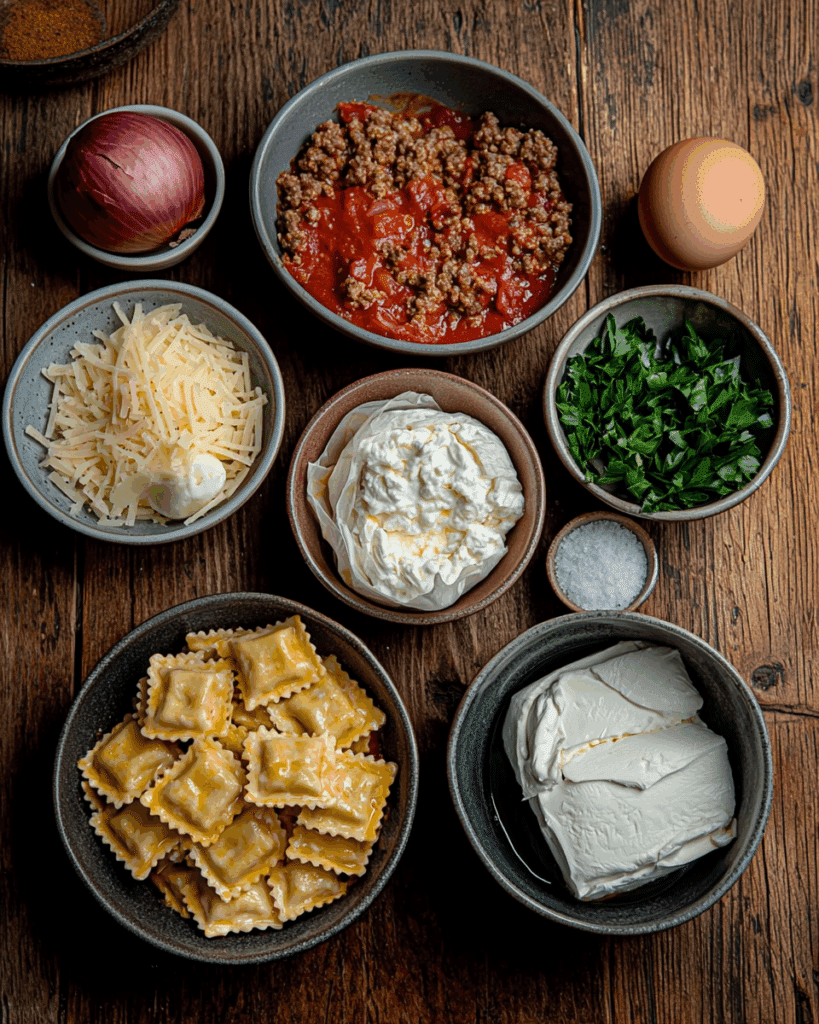 Ground beef or Italian sausage adds a savory, meaty base. Onion and garlic bring aroma and flavor that turn a jar of marinara into something special. Cheese ravioli acts as both the pasta and filling—one less step to worry about. The ricotta layer is where the magic happens: cream cheese adds body, sour cream brings smoothness, and parsley cuts through the richness. Mozzarella melts into that gooey top layer we all love, while Parmesan gives it a sharp, salty finish.