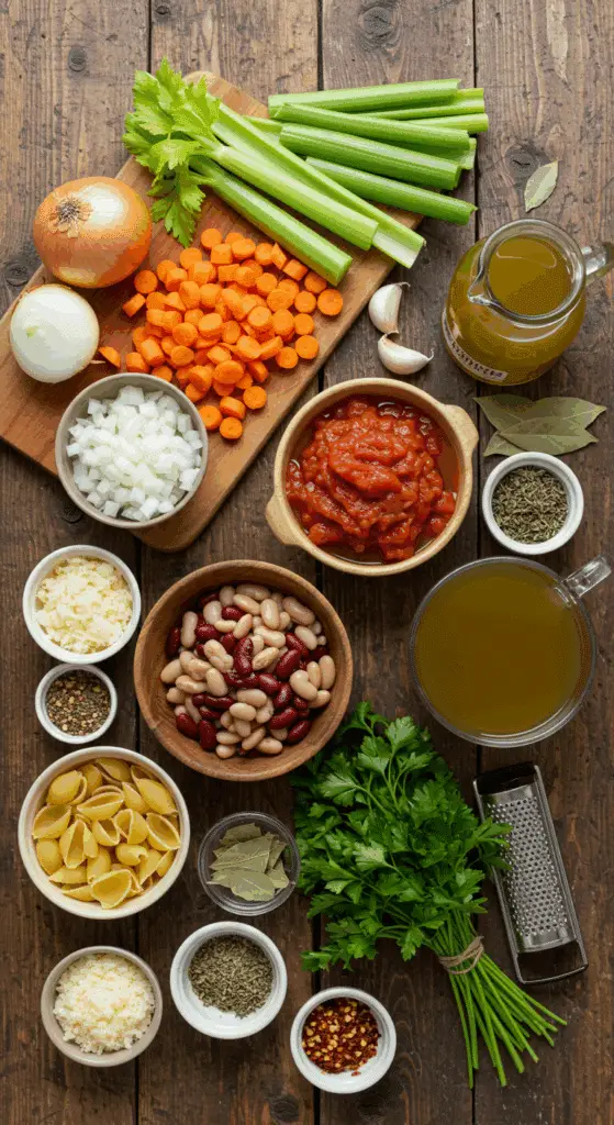To make Minestrone Soup for 4–6 servings, you’ll need these key ingredients. Each one adds a layer of flavor or texture to this comforting dish:
