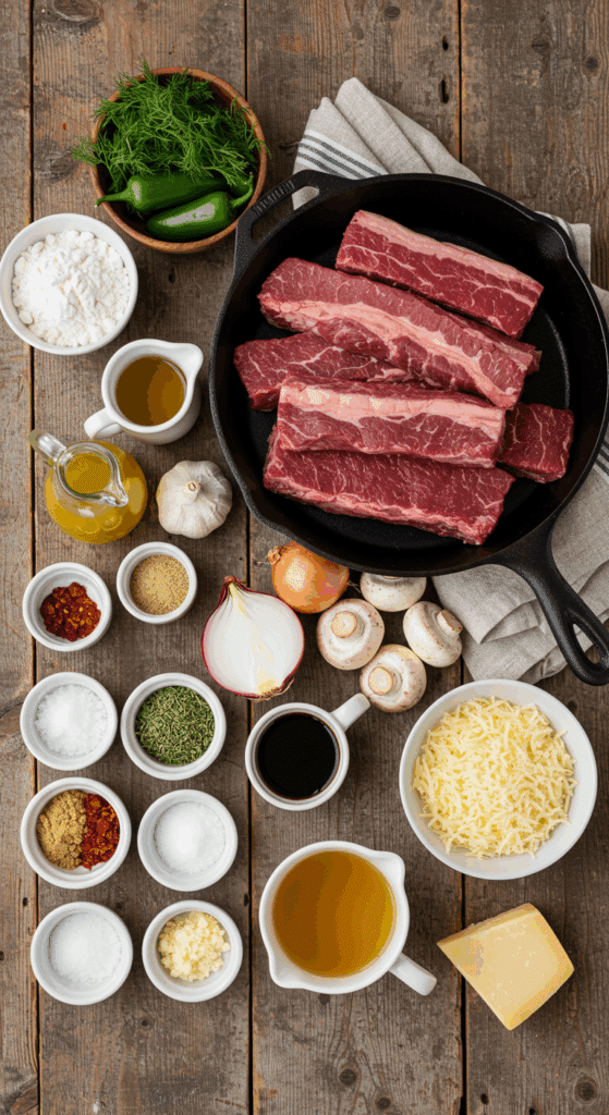 - Gather all ingredients: 1 teaspoon kosher salt, 1 teaspoon garlic powder, 1 teaspoon onion powder, 1 teaspoon black pepper, 1 teaspoon dried dill weed, ½ teaspoon dried rosemary, ½ teaspoon dried thyme, 2 tablespoons Parmigiano-Reggiano cheese, 2 ½ pounds boneless beef short ribs, salt, pepper, cayenne, 1 tablespoon olive oil, 1 large onion, ⅓ cup sliced mushrooms, 1 tablespoon flour, ⅔ cup chicken broth, 1 tablespoon soy sauce, ½ teaspoon Worcestershire sauce, 6 pepperoncini peppers, and ¼ cup unsalted butter.