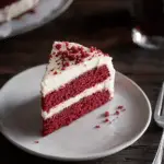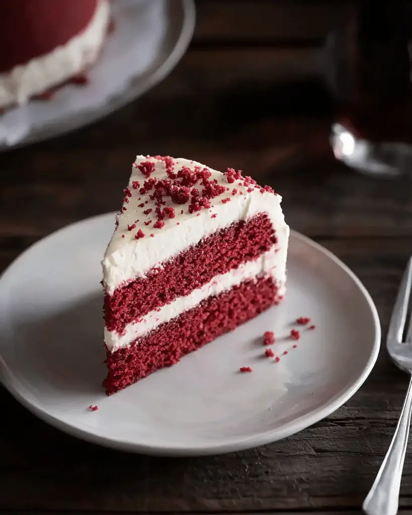 Summary: This recipe creates a moist, tender Red Velvet Cake using oil, buttermilk, vinegar, and cocoa powder, achieving its signature flavor and texture. It’s layered and frosted with a classic, tangy cream cheese buttercream made with butter, cream cheese, powdered sugar, and vanilla.