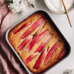 - Tip: Press rhubarb pieces lightly into the batter; sugar adds sparkle and texture.