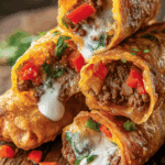Nacho Egg Rolls combine the gooey, spicy essence of nachos with the satisfying crunch of an egg roll, using flour tortillas instead of traditional egg roll wrappers for a softer, chewy texture. The filling mimics loaded nachos with taco-seasoned beef, warm nacho cheese, and fresh toppings like lettuce and tomatoes, plus a surprise crunch from Doritos. These egg rolls are quick to assemble, skillet-crisped (no deep frying needed), and perfect for dipping in salsa or extra nacho cheese. They’re versatile, kid-friendly, and ideal for entertaining or casual meals.