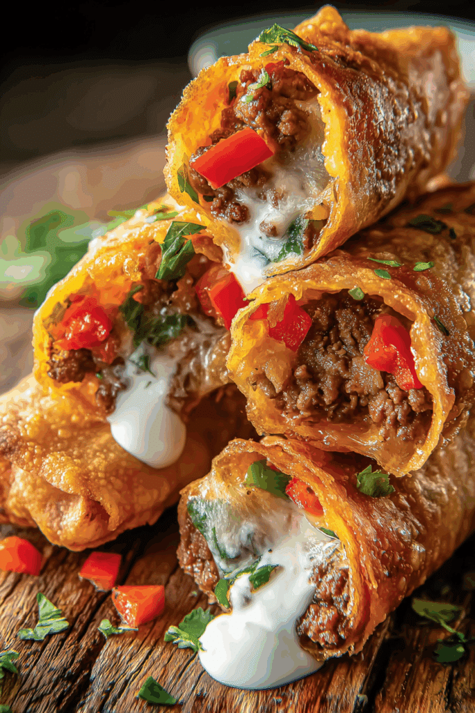 Craving a bold, cheesy, and crunchy twist on nachos? Nacho Egg Rolls are the ultimate fusion of Tex-Mex flavors wrapped in a crispy tortilla shell. Packed with seasoned ground beef, nacho cheese, fresh veggies, sour cream, and a sprinkle of crushed Doritos, these egg rolls deliver all the nacho vibes in a portable, golden package