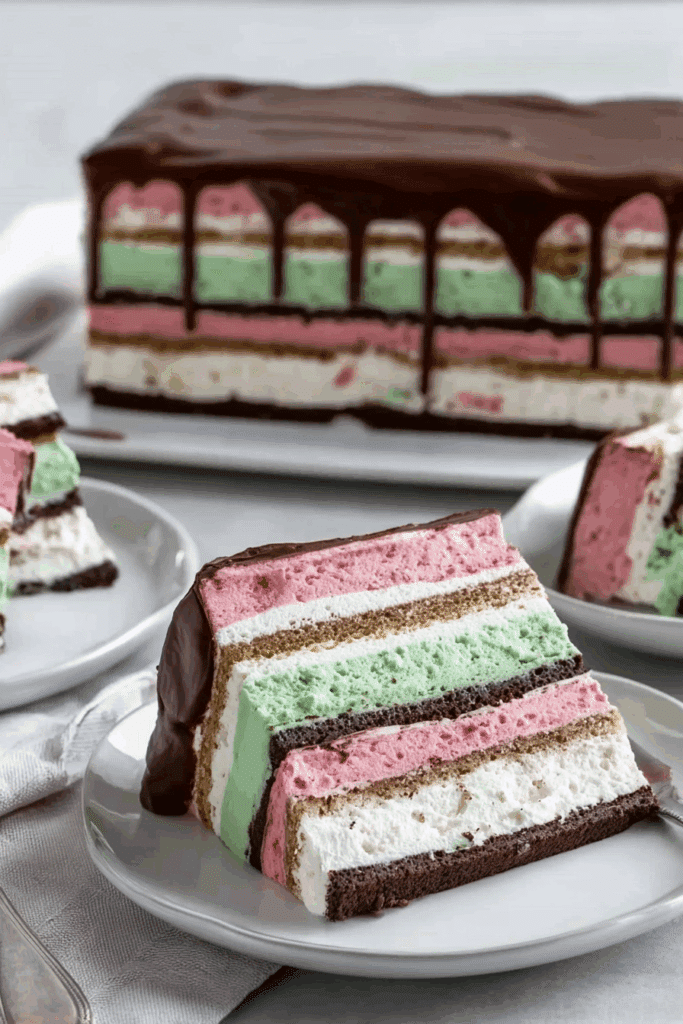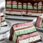 Neapolitan Ice Cream Sandwich Cake is a delightful mix of creamy, colorful layers that bring together vanilla, strawberry, and mint chip (or pistachio) ice cream in a fun, sandwich-style cake. It’s no-bake, making it super easy and ideal for warm weather. Here’s why it’s a winner: