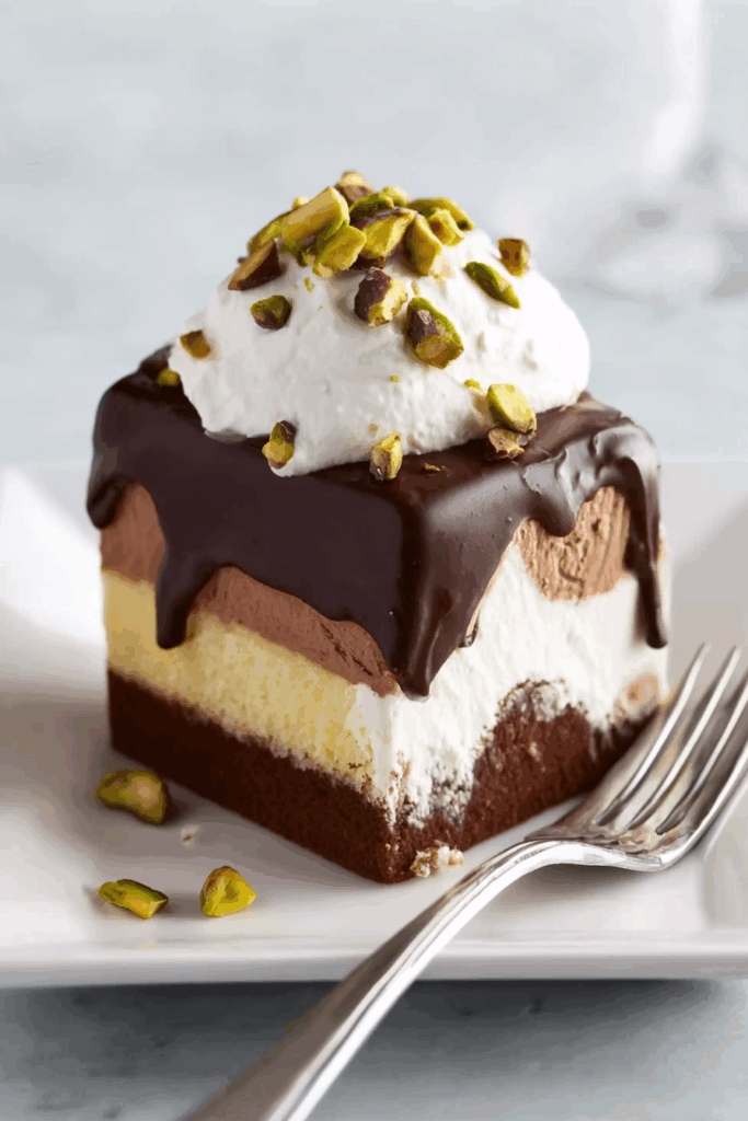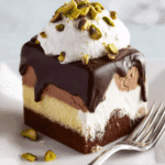 The Neapolitan ice cream brings a trio of flavors—creamy vanilla, rich chocolate, and fruity strawberry—in one scoop, making each bite exciting. Pound cake is soft and sturdy, holding the ice cream perfectly. The melted dark chocolate adds a decadent, crackly coating, while whipped cream and pistachios give a light and crunchy finish. Together, they create a balanced, beautiful dessert that’s as fun to eat as it is to look at.