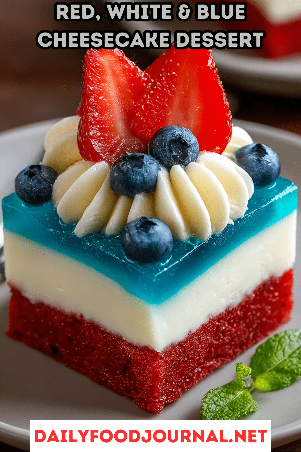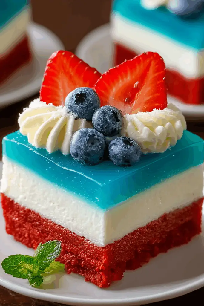 No-Bake Patriotic Cheesecake is the ultimate festive dessert, offering a creamy, colorful, and refreshing treat that’s perfect for patriotic celebrations. With its vibrant red crust, creamy white filling, blue Jell-O layer, and berry garnish, it’s a showstopper that’s as easy to make as it is impressive. Whether you’re hosting a Fourth of July barbecue, Memorial Day picnic, or any patriotic event, this recipe is sure to delight. So grab your ingredients, layer that cheesecake, and get ready to enjoy a dessert that’s pure red-white-blue bliss in every bite!
