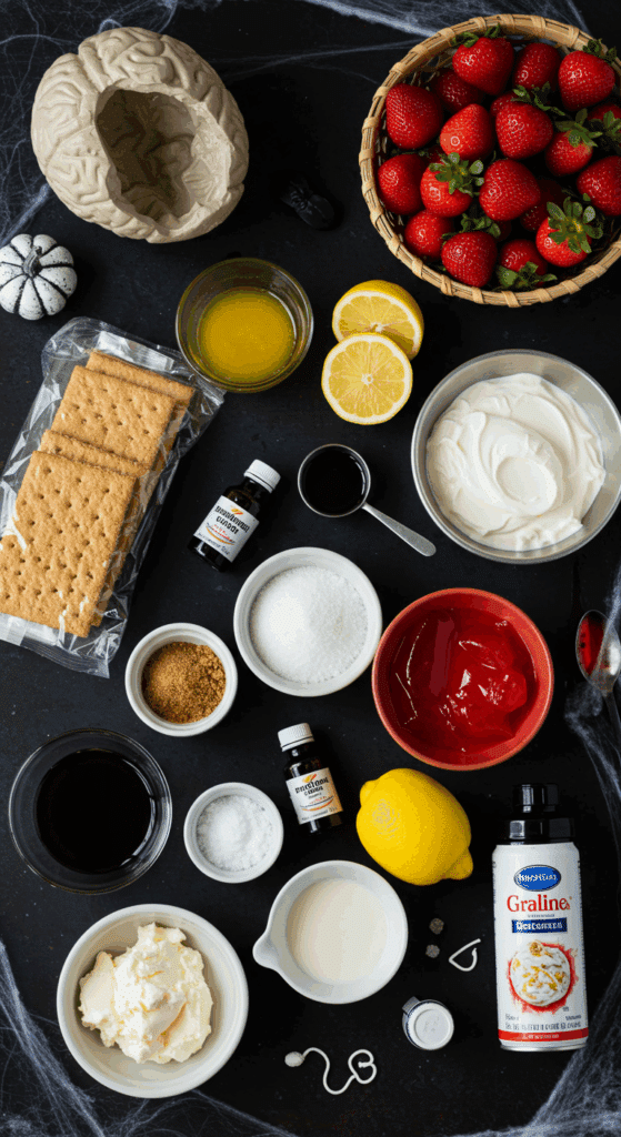 Strawberries provide vitamin C and antioxidants, making this dessert slightly nutritious. The cream cheese and heavy cream offer protein and calcium, while the graham cracker crust adds crunch. The red syrup and pink cheesecake create a spooky brain look, perfect for Halloween. The ingredients are widely available and adaptable for vegan or gluten-free diets, making this recipe versatile for party planning.