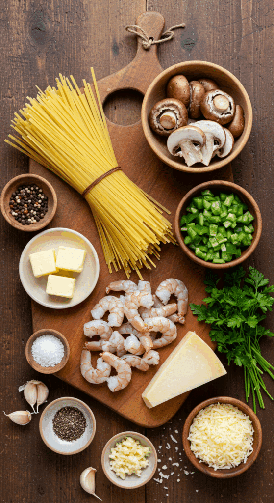 Why These Ingredients Matter: The shrimp and cheese provide protein and calcium, while the mushrooms and green pepper add fiber and vitamins. The butter and garlic create a rich, savory sauce that ties everything together, making this a balanced, nutritious meal with coastal vibes.