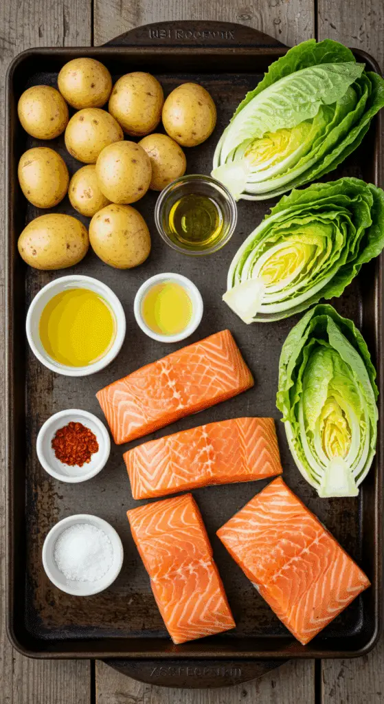 Here’s what you need to make One-Pan Roasted Salmon with Potatoes and Romaine. Each ingredient adds to the rich, fresh, and tender magic.