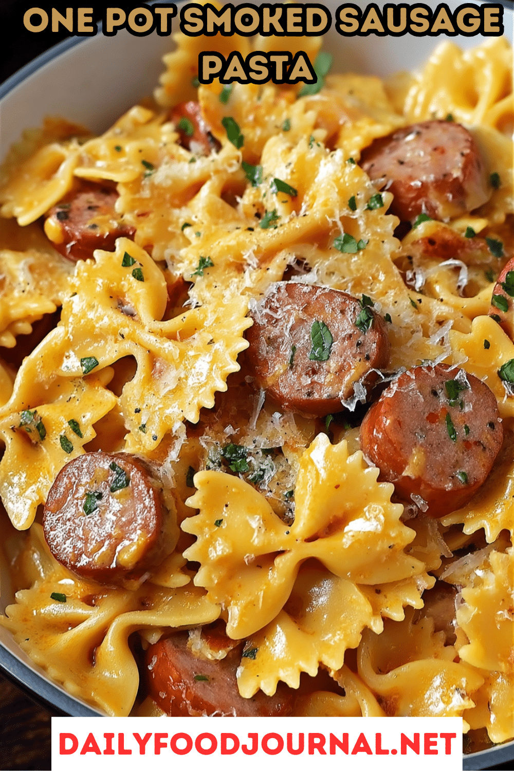 This One Pot Smoked Sausage Pasta is creamy, cheesy, and loaded with bold flavor. Cooked in one pan with bow tie pasta, cheddar cheese, and smoked sausage for an easy dinner win.