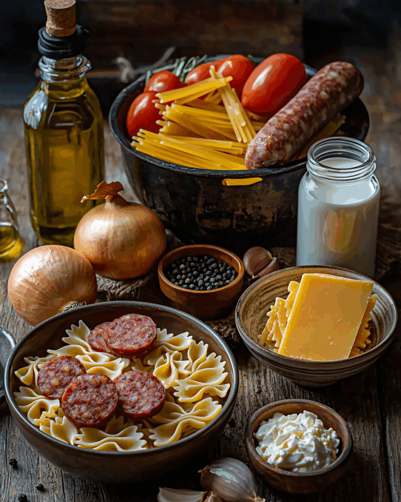 Smoked sausage is the star—use a good quality one for the best flavor. Olive oil gets everything started and helps brown the sausage. Onion and garlic are essential for depth and aroma. Chicken broth adds richness and helps the pasta cook right in the pot. Diced tomatoes bring a bit of acidity and balance. Heavy cream makes the sauce silky and luscious. Whole wheat bow tie pasta adds texture and fiber, and cheddar cheese ties it all together with sharp, gooey perfection. Black pepper keeps the flavors grounded and savory.