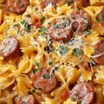 Smoked sausage has that old-school charm that reminds me of family meals growing up—always quick, always filling, always a hit. Paired with bow tie pasta, rich cream, and sharp cheddar cheese, this dish brings a mix of childhood favorites and grown-up flavor. It’s reminiscent of the casseroles or skillet meals my mom used to whip up, only with a little extra flair.