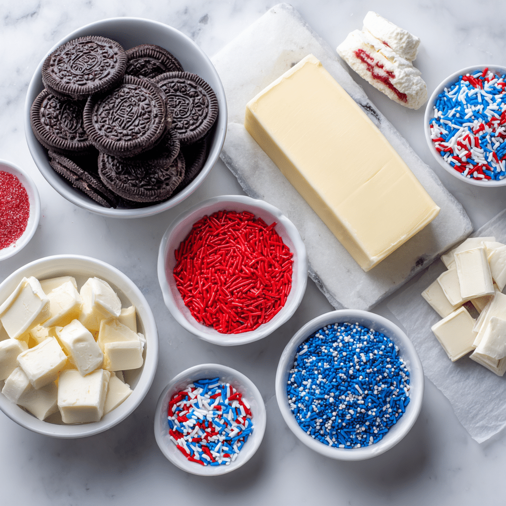 The Fourth of July Oreo Balls come together with a few key ingredients that create a rich, creamy, and colorful treat. Here’s what you’ll need and why each matters: