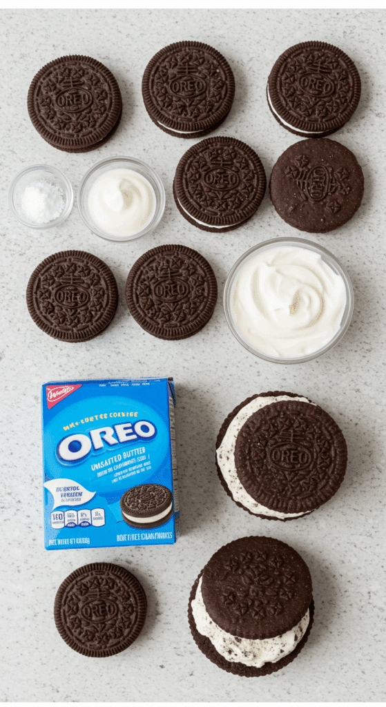 Here’s what you need to make Oreo Ice Cream Sandwiches. Each ingredient adds to the creamy, crunchy, and chocolatey magic.