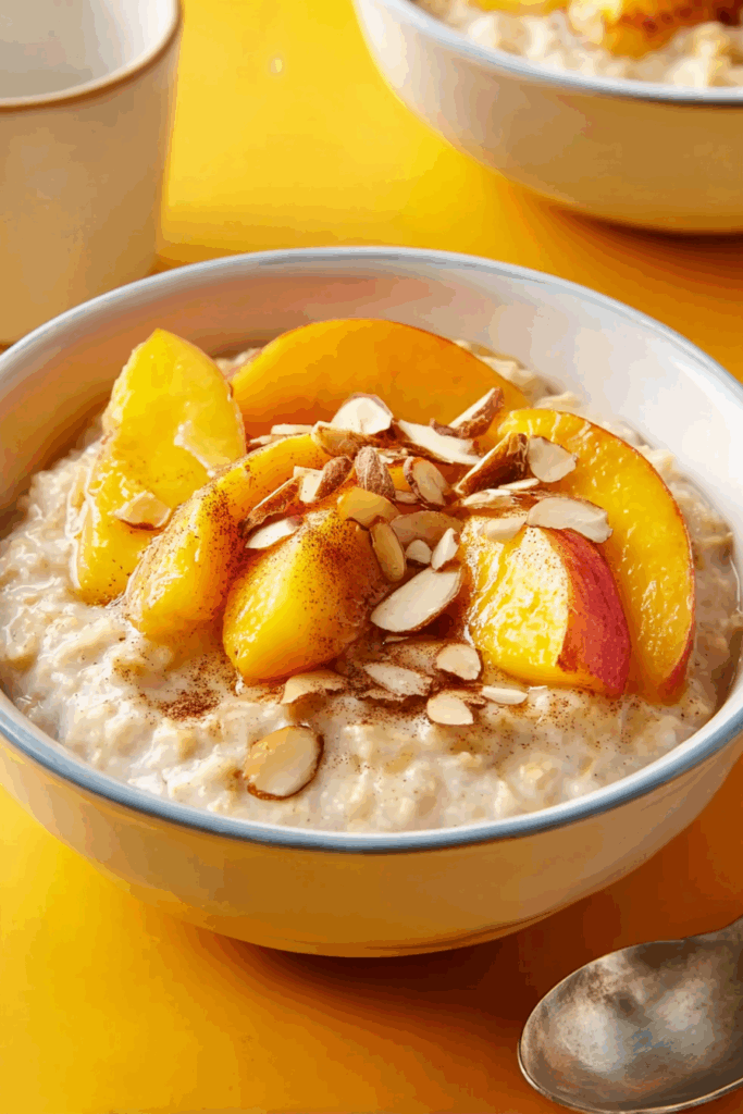 - Serve: Spoon into bowls and add optional toppings like sliced almonds, a sprinkle of brown sugar, cinnamon, or extra peach slices.