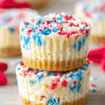 These Patriotic Mini Cheesecakes are the ultimate dessert for patriotic celebrations! With their creamy cheesecake filling, Golden Oreo crust, festive red, white, and blue sprinkles, and fluffy whipped cream, they’re perfect for 4th of July, Memorial Day, or any gathering. They’re a lighter treat with portion control, super quick to make, and so fun to customize. Grab your muffin tin, get the kids to help sprinkle the jimmies, and create these mini masterpieces. Share your creations in the comments—I’d love to see your patriotic bites!