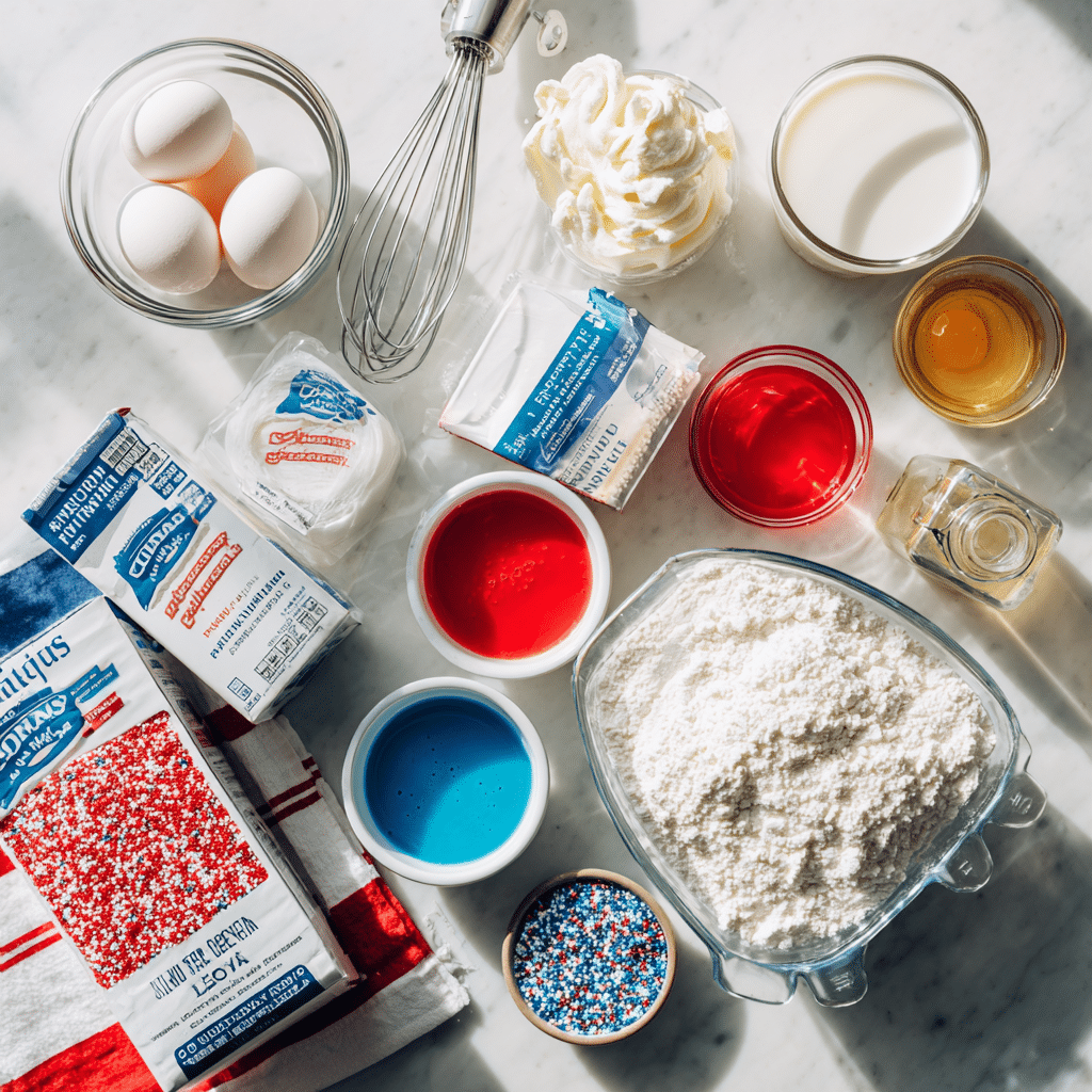 This cake is perfect for 4th of July barbecues, picnics, or any celebration needing a patriotic touch. Let’s check out the ingredients!