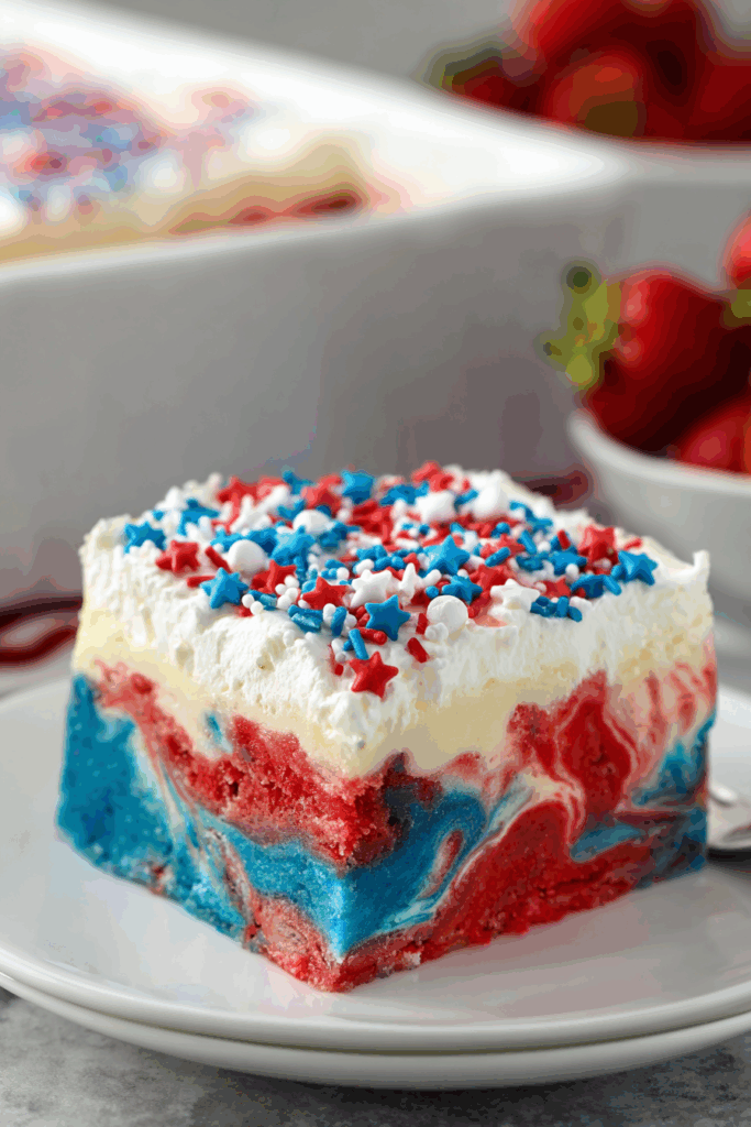 Creating a Patriotic Poke Cake is like crafting a creamy, colorful flag in a pan! Here’s how to make it look amazing: