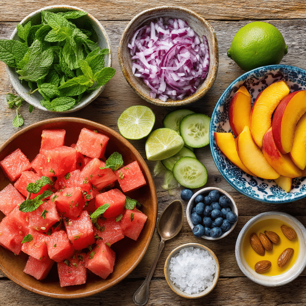 - Make-Ahead: Prep watermelon, peaches, and cucumber up to 4 hours in advance; store separately in the fridge. Chop mint and mix with lime juice and salt just before serving to preserve vibrancy.