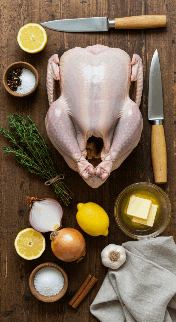 - Aromatics (Thyme, Lemon, Onion, Garlic): Infuse the cavity with flavor, keeping the meat moist.