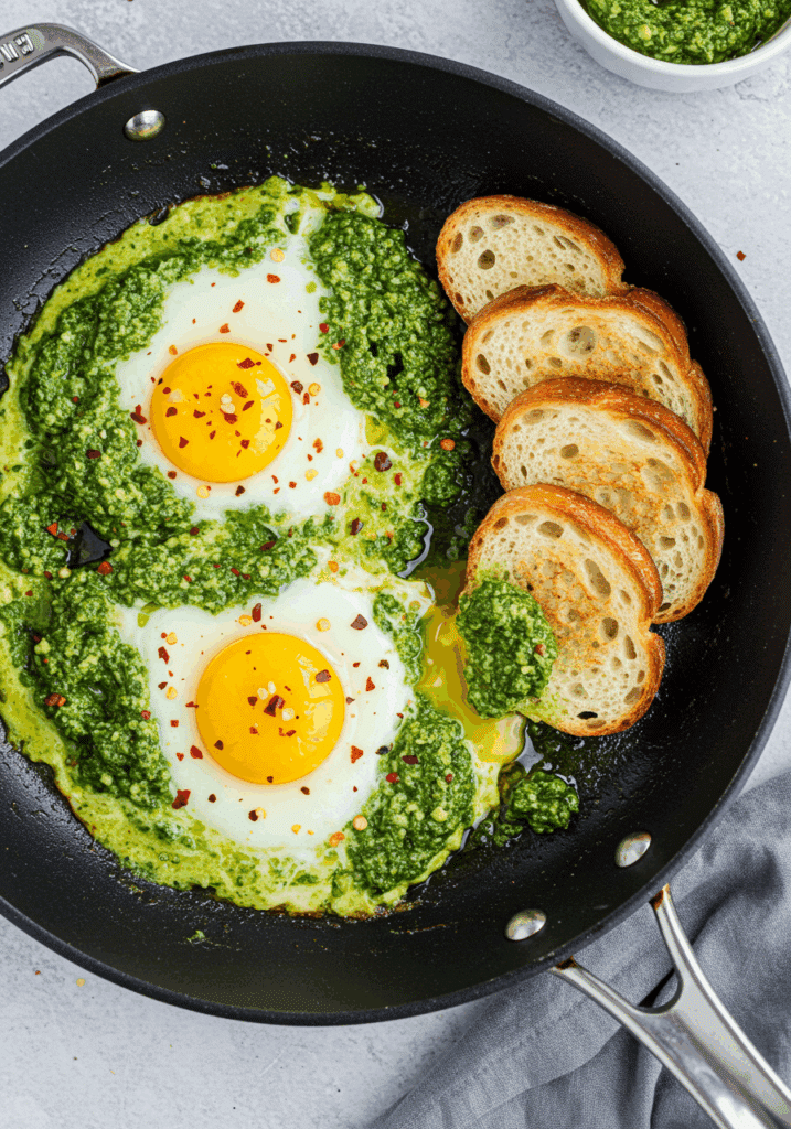 Tip: Spread pesto thinly to coat the eggs without overwhelming them; adjust cooking time for your preferred yolk consistency.