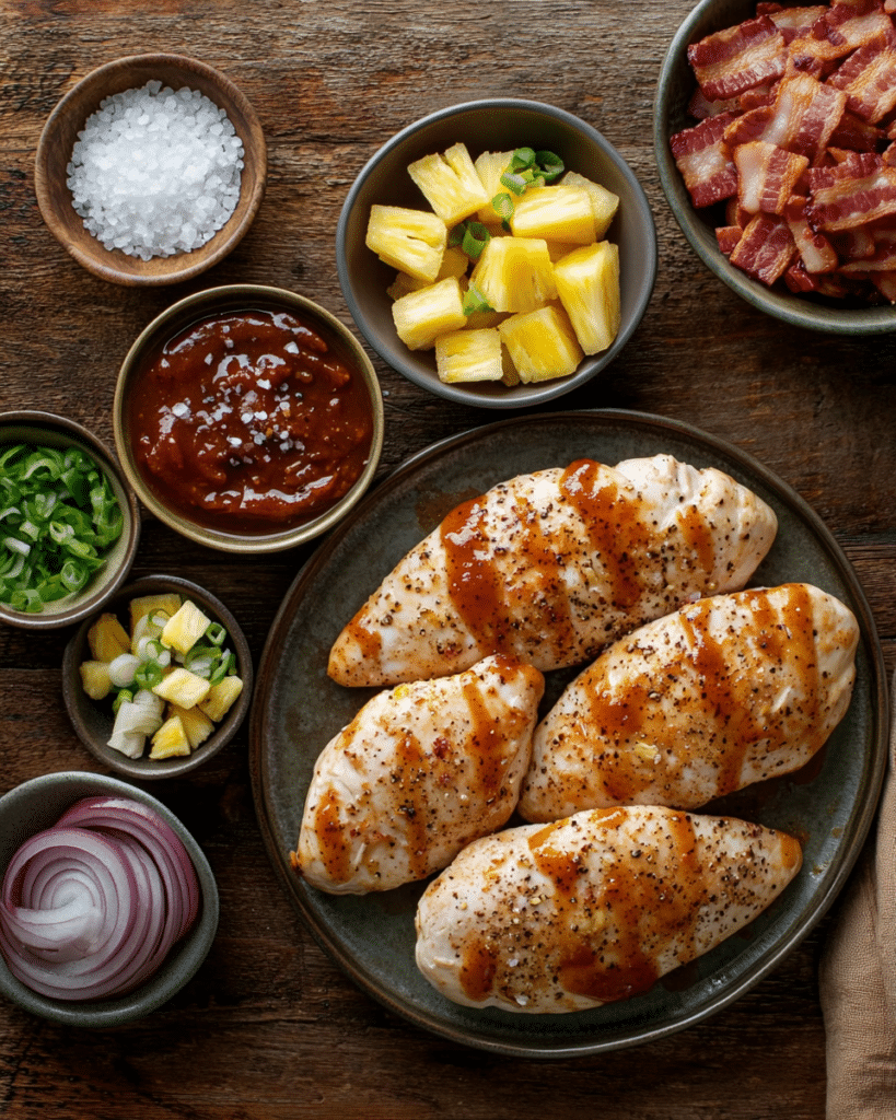 Boneless, skinless chicken breasts are the perfect canvas, especially thinner cuts that bake evenly and stay juicy. Salt and black pepper provide a simple but essential seasoning base that brings out the chicken’s natural flavor. Low-sugar BBQ sauce offers bold, tangy sweetness without overwhelming the dish with too much sugar. Fresh diced pineapple adds juicy sweetness that pairs perfectly with the smoky elements. Crispy cooked bacon crumbles provide a rich, savory crunch that balances the sweet pineapple beautifully. Red onion slices add a mild sharpness and a pop of color to the dish. Mozzarella cheese melts into creamy, stretchy perfection over all the layers.