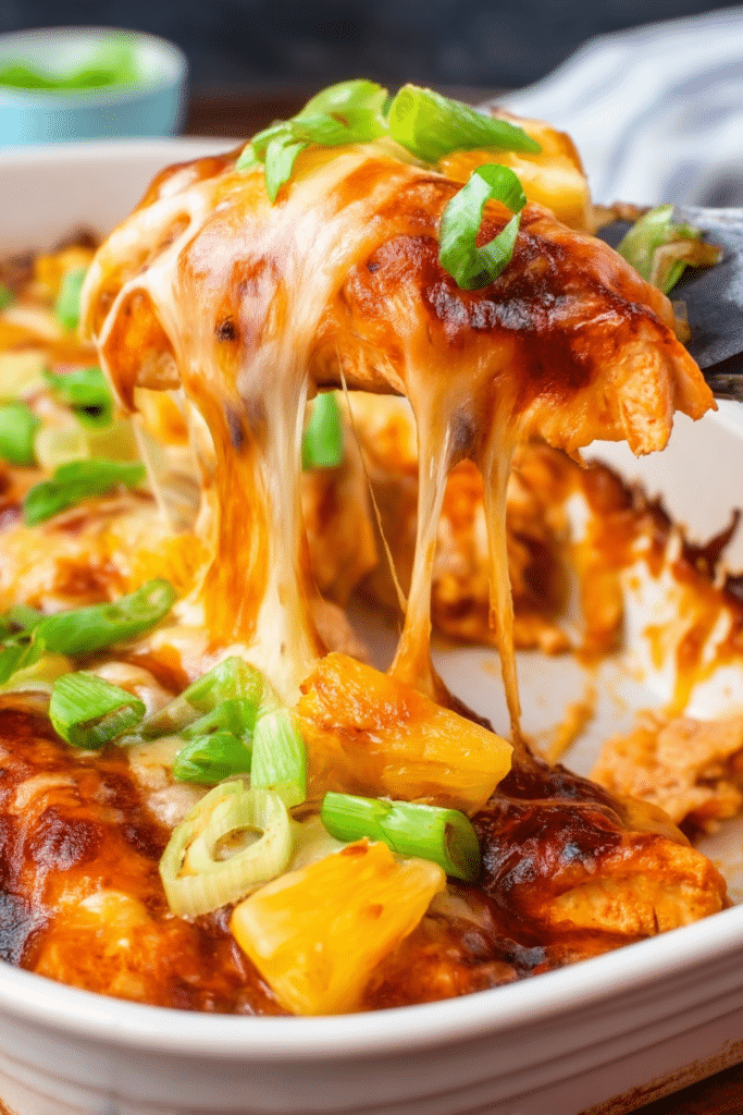Remove from the oven and top with extra diced pineapple and fresh green onions. Serve immediately for the freshest, boldest flavor.