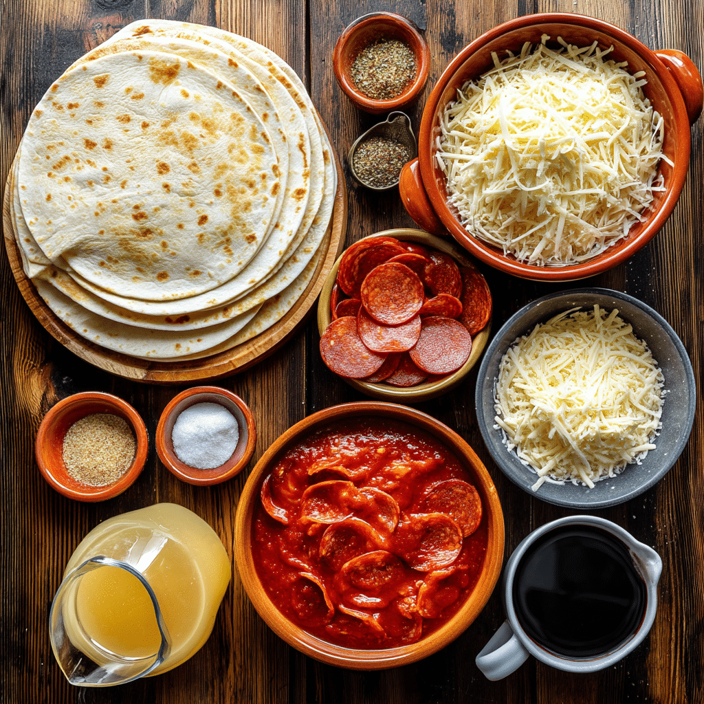 Why They’re Important: Tortillas provide the portable wrapper, pizza sauce and mozzarella deliver the classic pizza taste, and pepperoni adds savory depth. The garlic-herb butter and Parmesan create a crispy, flavorful crust, while dipping sauces and garnishes elevate the experience.
