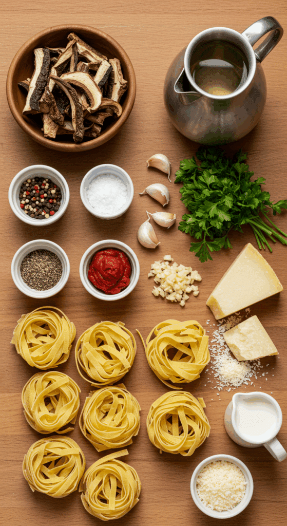 • Gather all ingredients: 1 ½ ounces dried porcini mushrooms, boiling water, salt, black pepper, ¼ cup olive oil, 3 garlic cloves, ½ teaspoon crushed red pepper, ½ cup parsley, 1 ½ tablespoons tomato paste, 9 ounces tagliatelle, 1 ½ ounces Parmesan, 3 tablespoons heavy cream.