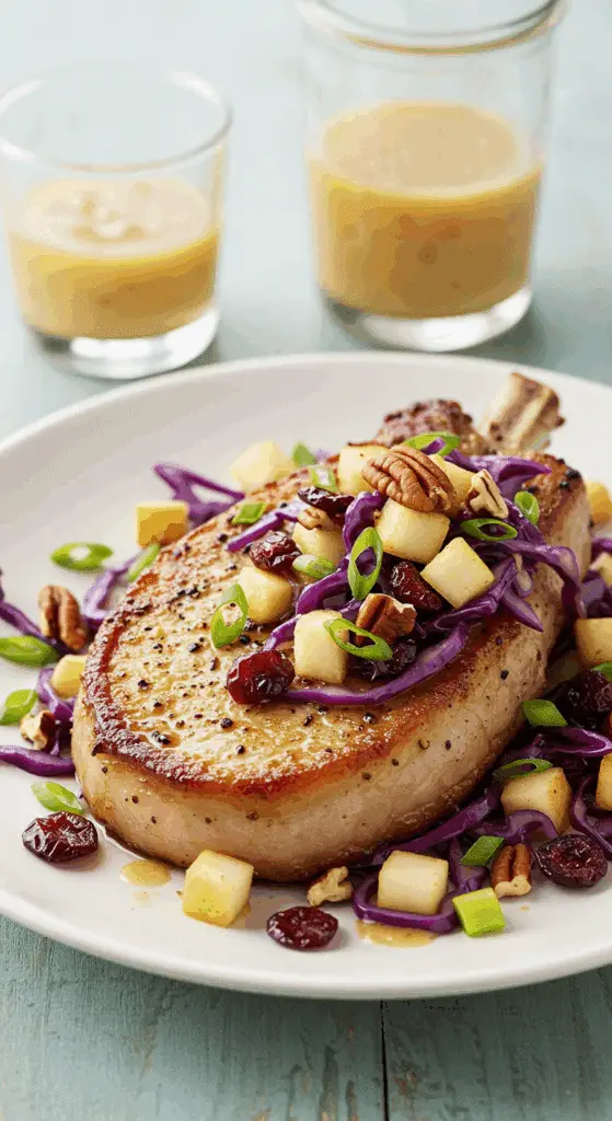 Craving a hearty yet refreshing meal that’s quick enough for a weeknight but feels special? What if you could sear juicy pork chops and pair them with a vibrant pear-pecan slaw in under 40 minutes? Pork Chops with Pear-Pecan Slaw is your answer—a perfectly seasoned, bone-in pork chop served with a crunchy, sweet-tangy slaw that’s bursting with fall flavors