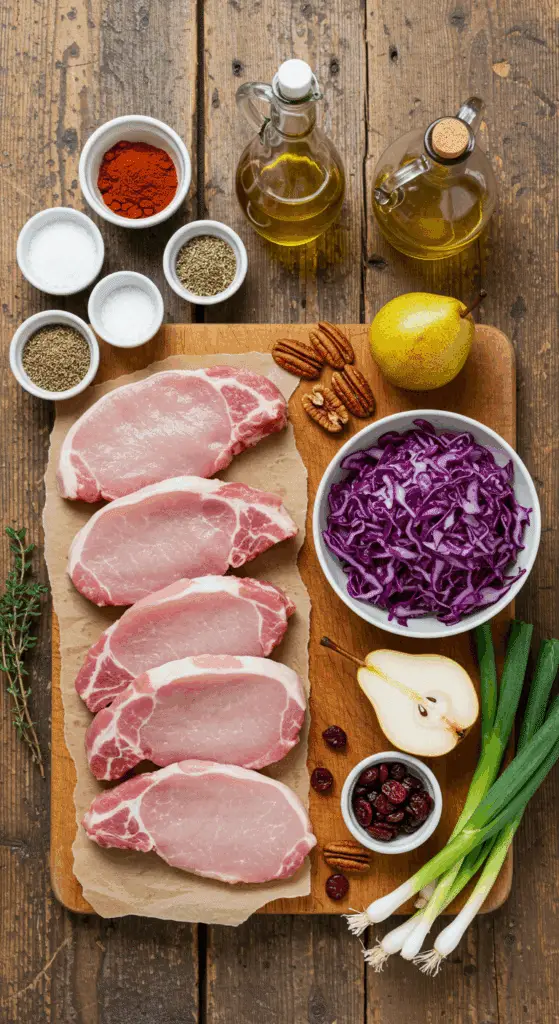 What makes Pork Chops with Pear-Pecan Slaw so special? It’s a balanced, one-skillet meal (plus a small bowl for pecans) that combines tender, paprika-thyme-rubbed pork chops with a colorful slaw of red cabbage, juicy pear, toasted pecans, and dried cranberries, all tied together with a tangy apple cider vinegar dressing. The contrast of savory pork and sweet-crisp slaw makes every bite exciting. This dish is fast, versatile, and perfect for weeknight dinners, fall gatherings, or meal prep, with minimal cleanup and maximum flavor.