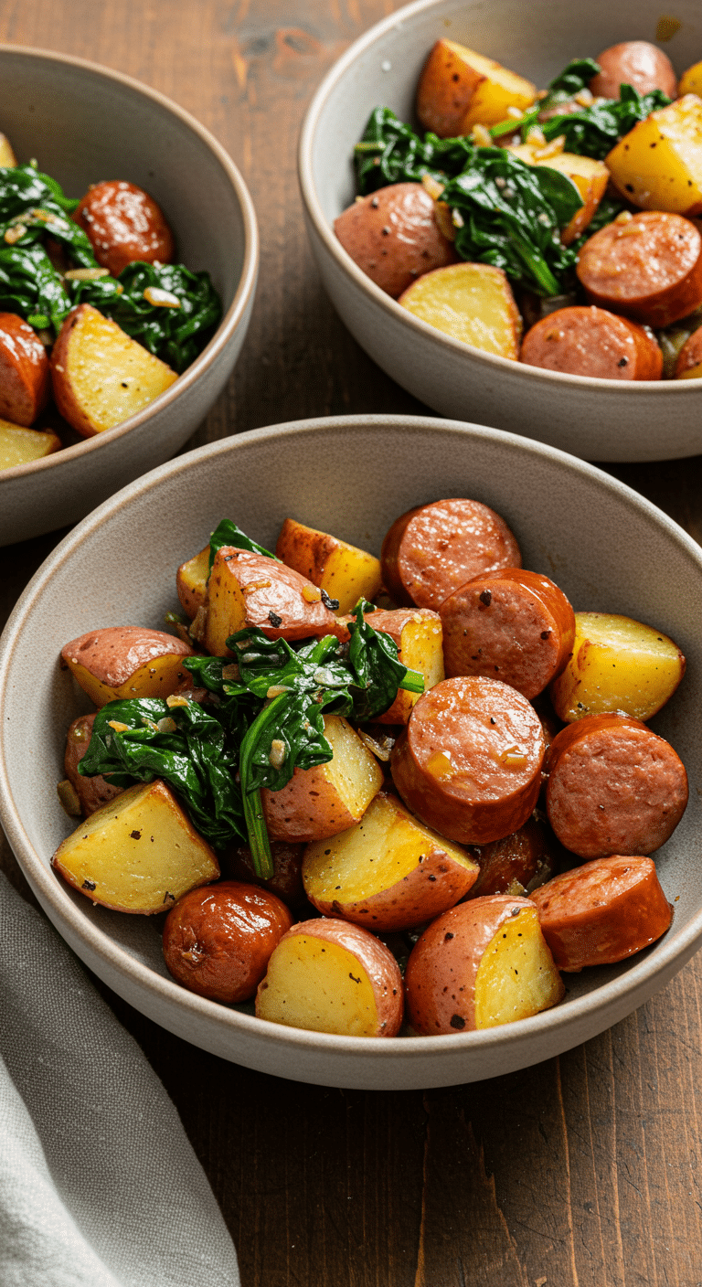 - Serving: Spoon generous portions onto plates or serve family-style from the skillet for a cozy vibe. Ensure each serving gets a mix of potatoes, kielbasa, spinach, and sauce.
