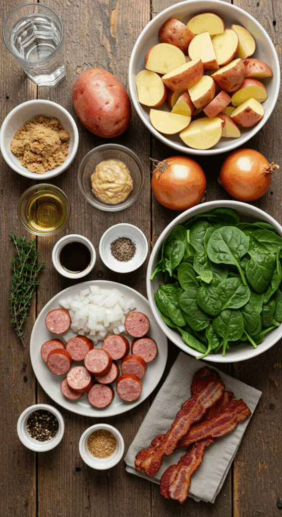 Why These Ingredients Matter: The kielbasa and bacon provide protein and smoky flavor, while the potatoes and spinach add fiber, vitamins, and texture. The mustard sauce balances sweet, tangy, and savory notes, making this a hearty yet balanced meal perfect for any occasion.
