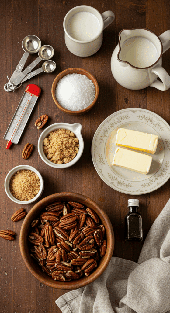 - Gather 1 ½ cups toasted pecans, 1 ½ cups white sugar, ¾ cup brown sugar, ½ cup milk, ⅜ cup (6 tablespoons) butter, and 1 teaspoon vanilla extract.