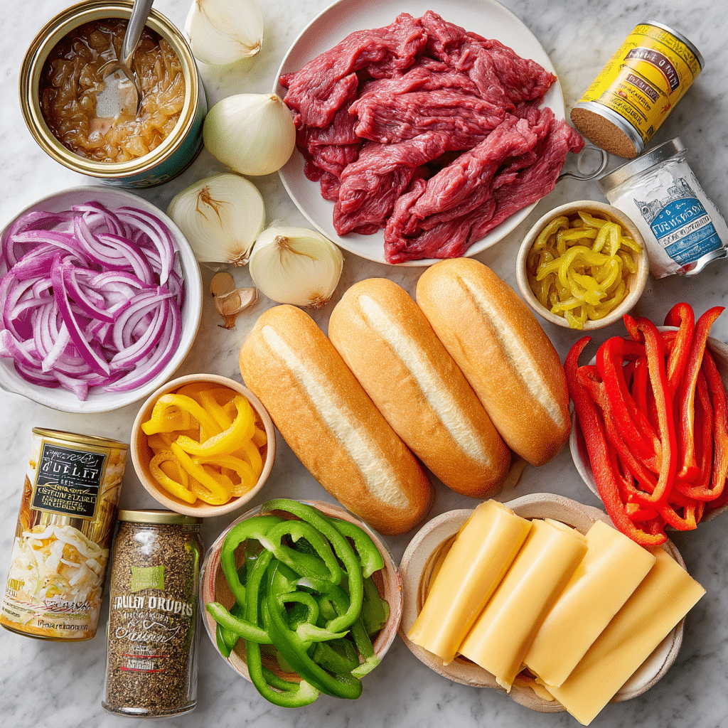 1. Combine Ingredients: In a 4- or 5-quart slow cooker, mix sliced steak, onions, French onion soup, garlic, Italian dressing mix, beef base, and pepper.