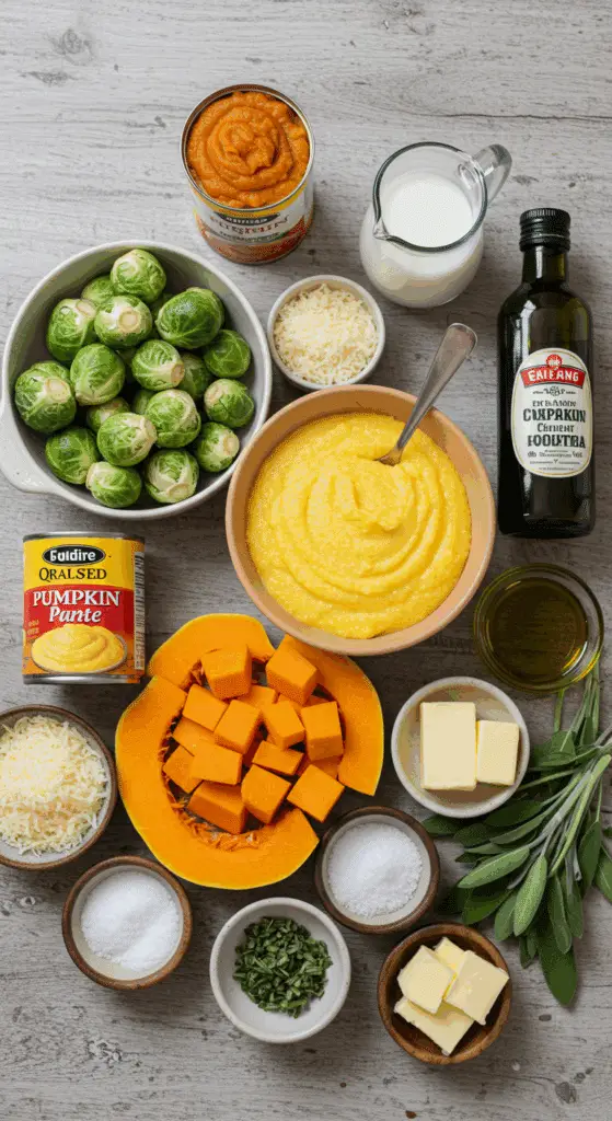 - Gather all ingredients: 1 pound Brussels sprouts, 1 pound butternut squash, 2 tablespoons olive oil, kosher salt, pepper, 2 cups milk, 1 cup polenta, 15-ounce can pumpkin puree, ¾ cup grated Parmesan, 2 tablespoons butter, 2 tablespoons sage, shaved Parmesan.