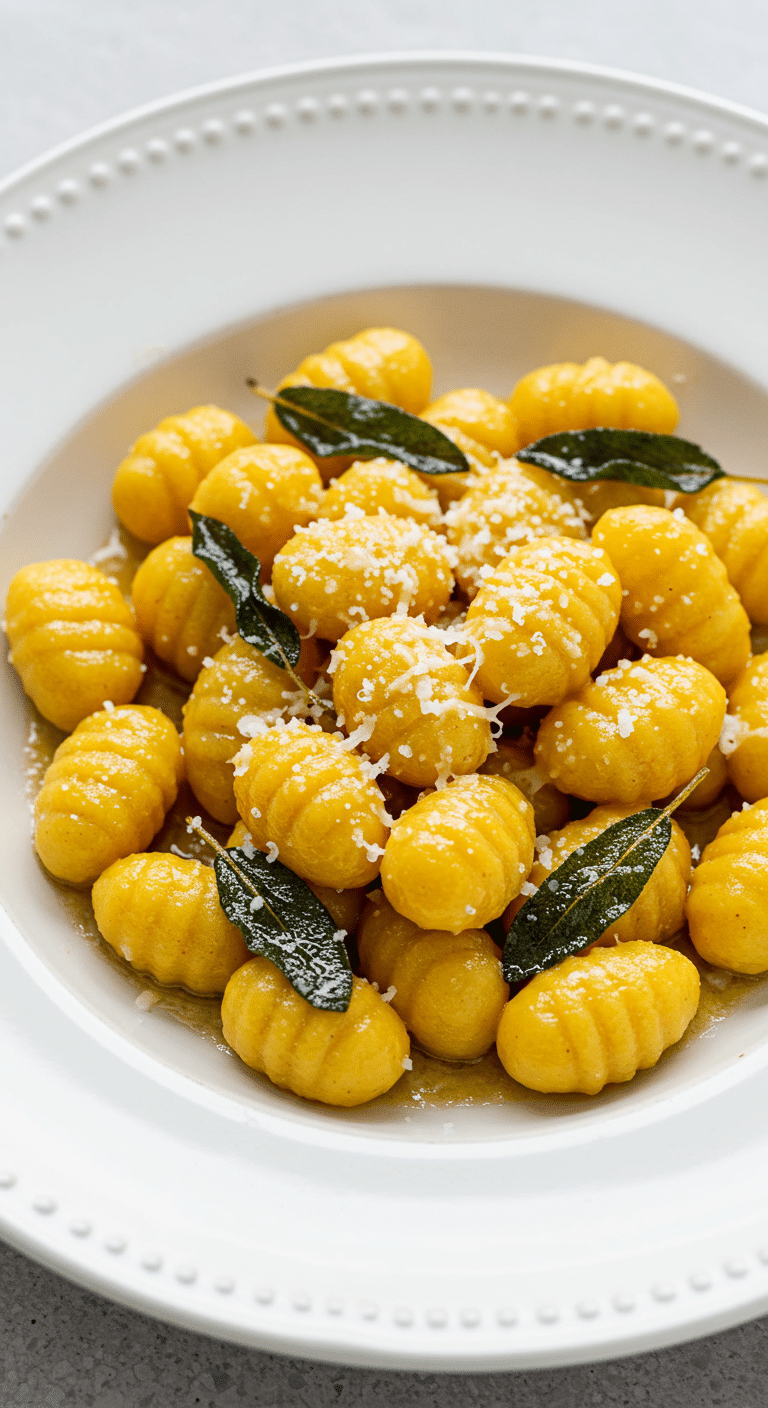 Use shallow, warm bowls to keep the cozy vibe—white or earthy tones make the orange gnocchi pop. Divide gnocchi into four portions (~1 cup each), spooning extra brown butter sauce over each. Arrange 2-3 crispy sage leaves on top for crunch and a Halloween-worthy “leaf pile” look. Sprinkle with extra Parmesan or a pinch of black pepper for a “dusty” effect. For spooky flair, drizzle with a tiny bit of balsamic glaze to mimic a dark potion swirl.