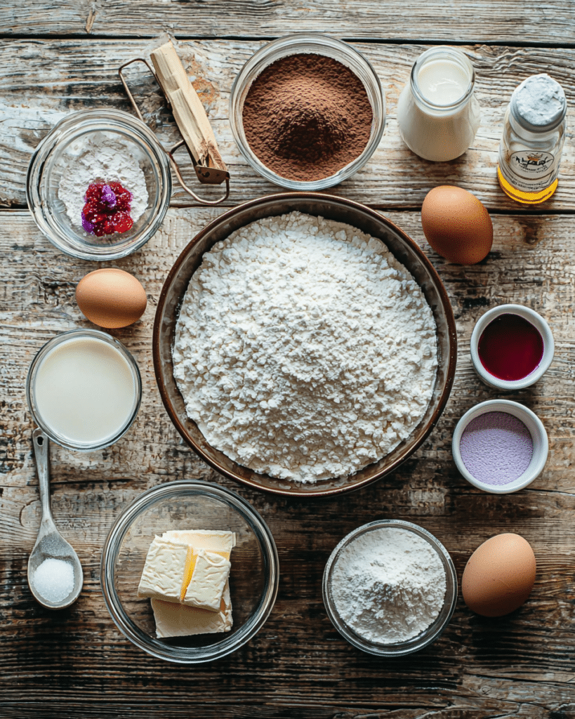 Eggs provide structure and richness, while food colorings (red and purple) give the cake its vibrant, dramatic hue.
