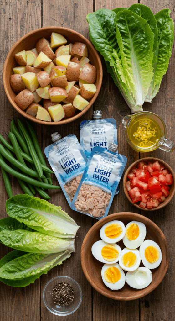 To make a Quick Niçoise Salad for 4 servings, you’ll need these key ingredients. Each one brings a classic Niçoise element to the plate: