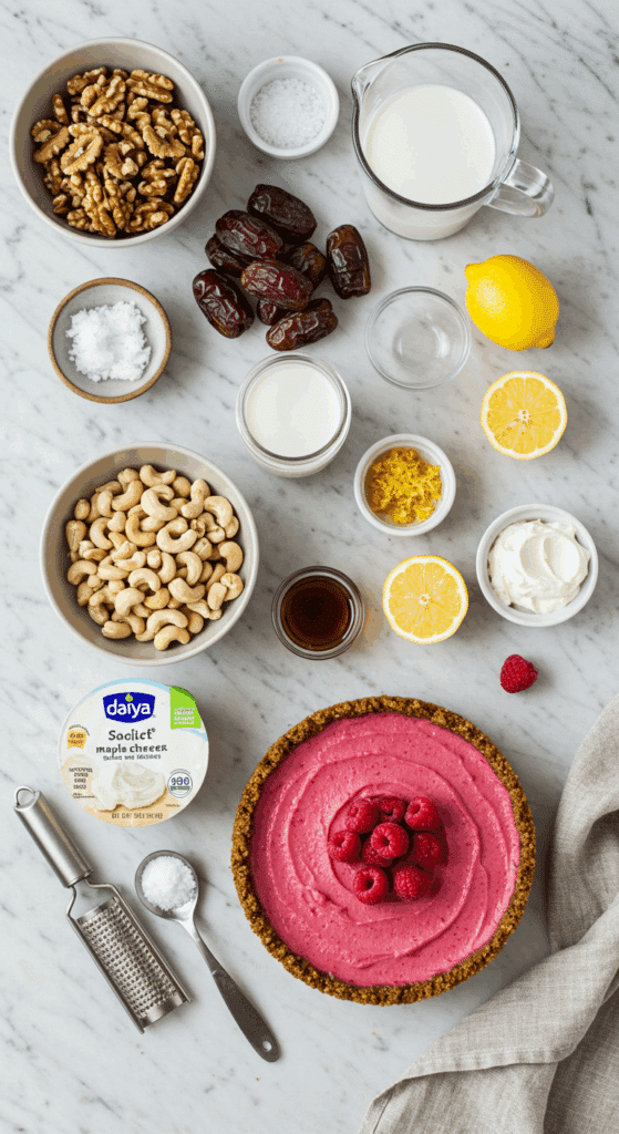 Here’s what you need to make this Raspberry Vegan Cheesecake. Each ingredient adds to the crunchy, creamy, and fruity magic.