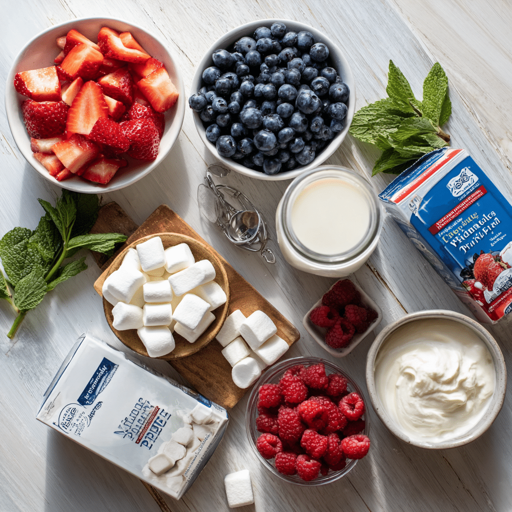A great Red White Blue Cheesecake Salad starts with simple, fresh ingredients. Here’s what you’ll need to serve 8-10 people:
