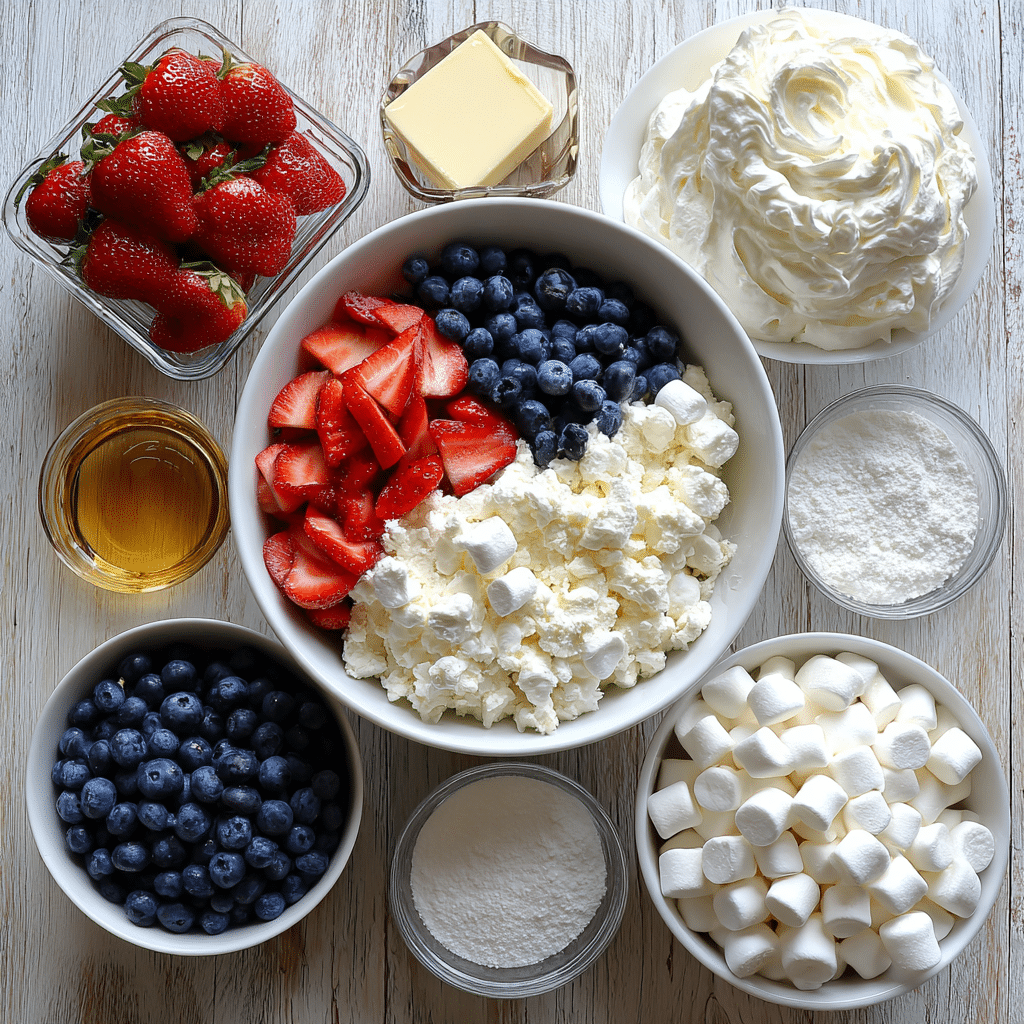 Red, White & Blue Cheesecake Salad uses simple ingredients to create a creamy, colorful dessert. Here’s what you need and why each one matters: