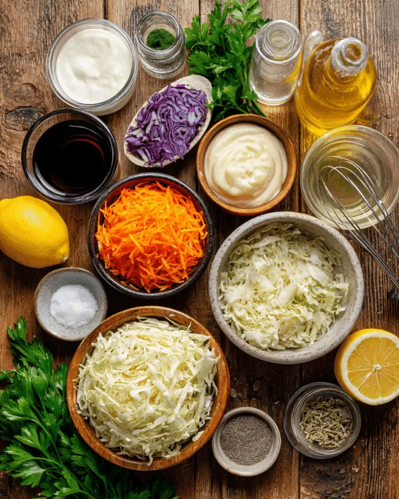 This coleslaw comes together with ingredients that create a creamy, tangy, and crisp dish. Here’s what you need and why each matters: