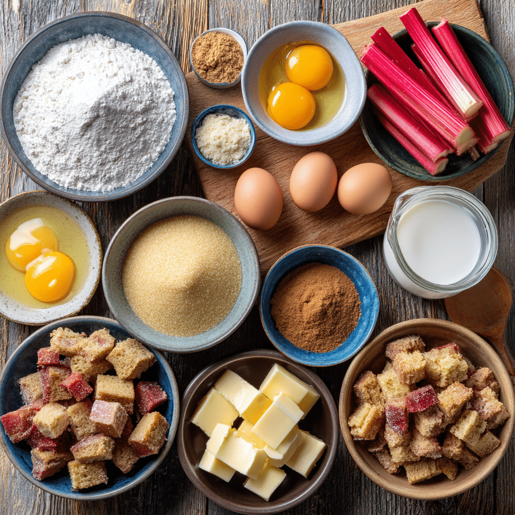 Why They’re Important: The rhubarb delivers a tart, juicy filling, while cinnamon and sugars add cozy sweetness. The buttermilk and eggs create a soft, cake-like base, and the streusel provides a buttery, crunchy finish, making each spoonful a perfect balance of textures and flavors.