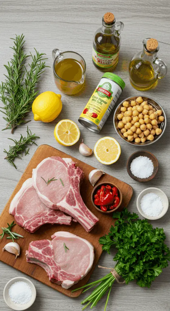 Rosemary-Garlic Pork Chops with Chickpeas uses simple, bold ingredients for a satisfying result. Here’s what you’ll need for 4 servings: