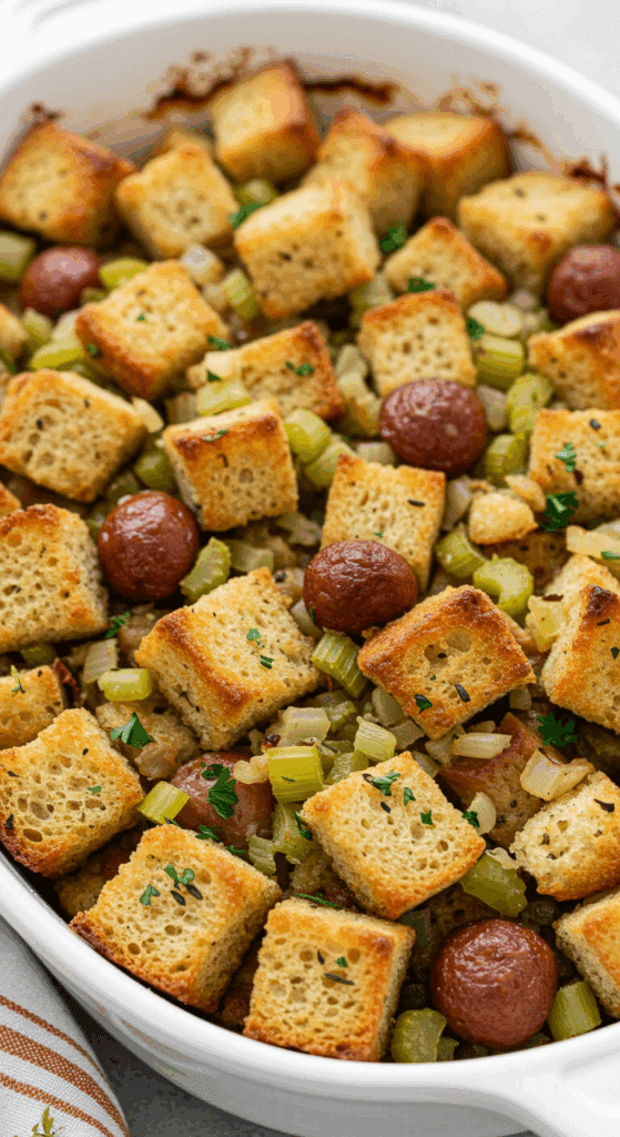 Sausage and Herb Stuffing is cherished for its hearty, savory base, sweet-tart accents, and golden, crispy top. Here’s what makes it special: