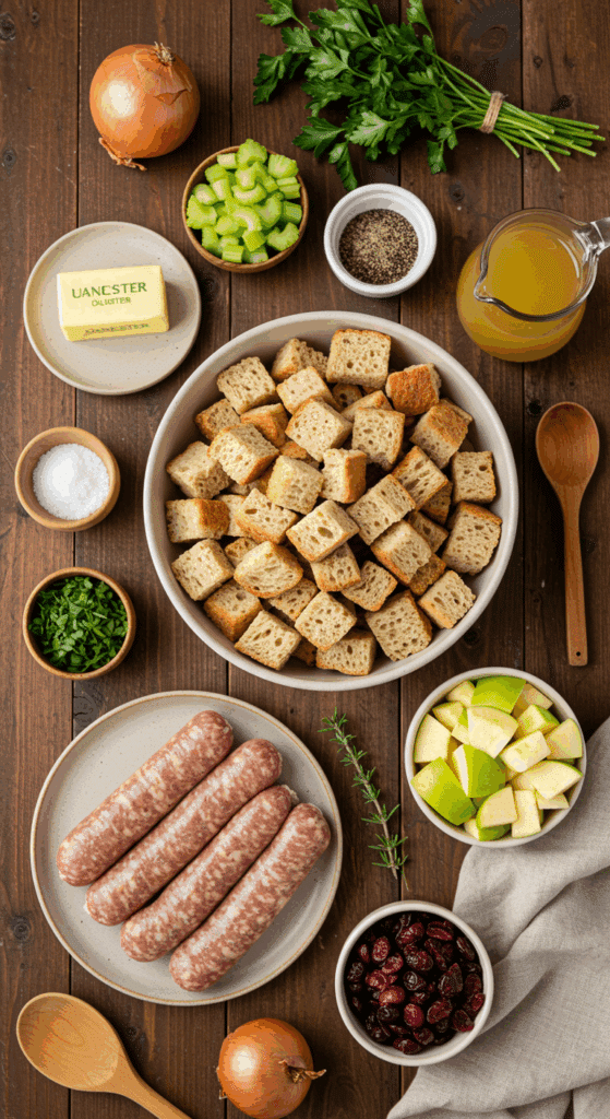 - Gather all ingredients: 16 cups bread cubes, 8 tablespoons butter, 2 cups onion, 1 cup celery, 2 Granny Smith apples, 2 tablespoons parsley, 1 tablespoon salt, 1 teaspoon pepper, ¾ pound sausage, 1 cup chicken stock, and 1 cup dried cranberries.