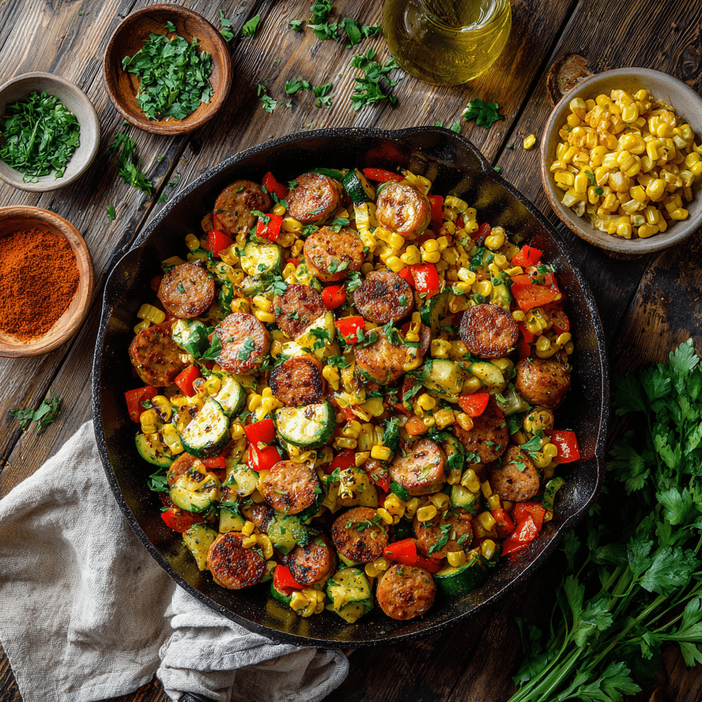 Craving a flavorful, fuss-free dinner that’s ready in just 30 minutes? This Sausage and Veggies Skillet is your go-to! Packed with smoky sausage, sweet corn, crisp zucchini, and vibrant red bell pepper, this one-pan dish is a perfect balance of savory and fresh. With a touch of chili powder and fresh cilantro, it’s a simple yet bold meal that’s ideal for busy weeknights, meal prep, or a casual family dinner. Using just one skillet means minimal cleanup, so let’s fire it up and get cooking!